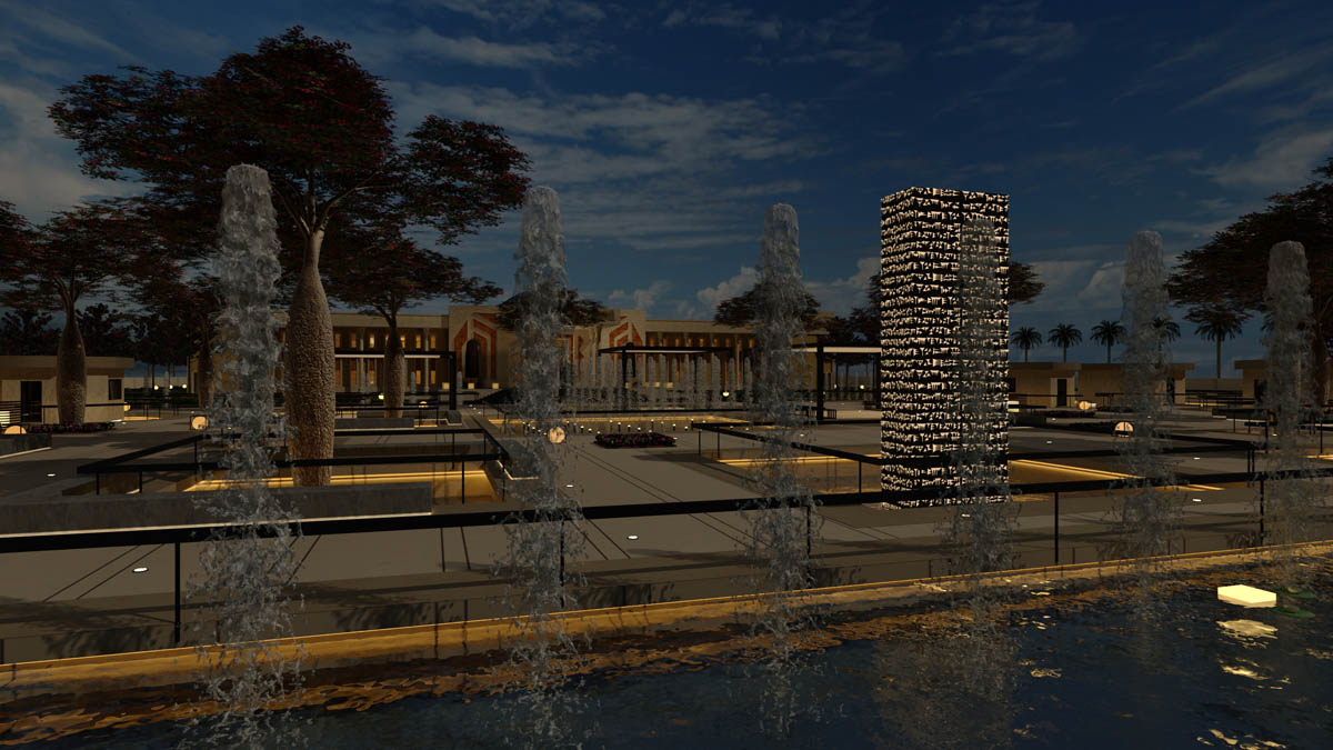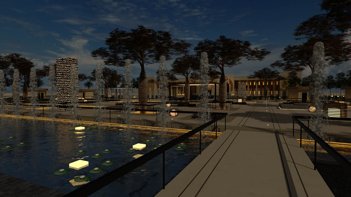 It is formed by two main layers, a water layer and a concrete layer. Designed landscape elements, from sculptures to light elements, transverse these two layers. This landscape’s purpose is to showcase the power of the court while giving an air of relaxation.