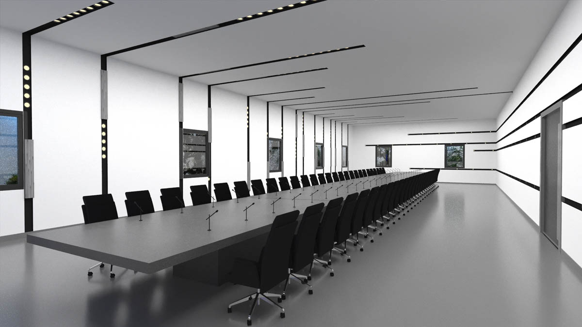 This project is a conference room. The design is pure and modern, leaning toward being futuristic. The light system and the sound system are embedded in the walls of the room creating dynamic lines that dictates the aesthetics of the room.